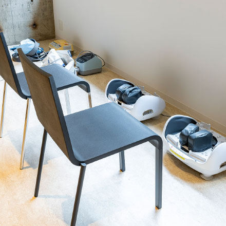 バリアフリー設計の館内には、リハビリ機器、リラクゼーションスペース、休憩スペースなどを完備。快適で安心して過ごせる環境を整えています。